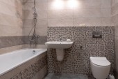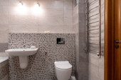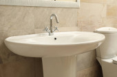 Biały czysty łazienka umywalka bateria błyszczący i kamień mydelniczka.