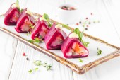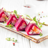 Buraków zwoje nadziewane warzywa i śledzia, rosyjski zakąska pod futro w kreatywnych prezentacji. Pyszne jedzenie, restauracja, uroczysty porcję, Boże Narodzenie przekąska