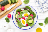 Źródlana Sałatka z grzybami, pomidorami cherry, awokado i cebuli. Pyszne wegetariańskie lunch, zdrowe jedzenie