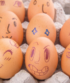 Zabawny Osiołek na pisanki na niebieskim tle. Różne twarze na jajach. Emocje. Ponuraków. Emoji.