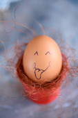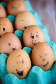 Zdjęcie "Zabawny Osiołek na pisanki na niebieskim tle. Różne twarze na jajach. Emocje. Ponuraków. Emoji." może być wykorzystywane do celów osobistych i komercyjnych zgodnie z warunkami zakupionej licencji Royalty-free. Obraz jest dostępny do pobrania w jakości wysokiej rozdzielczości do 5760x3840.