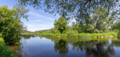 Rzeka płynie wśród zwykłego. Na brzegu rosną zieleni drzew i krzewów. Blue sky znajduje odzwierciedlenie w ciemne wody. Ołoniec Karelia, Federacja Rosyjska.