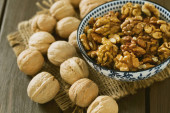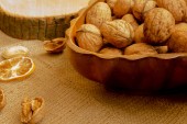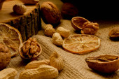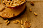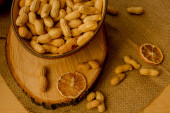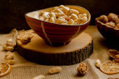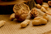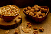 Orzeszki ziemne, orzechy włoskie, luźne, na płótnie i w salaterki.