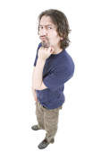 młody człowiek dorywczo, patrząc w górę, na białym tle na biały
