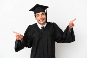 Człowiek na jego ukończenia Uniwersytetu dzień cieszyć się taniec podczas słuchania muzyki na imprezie na na białym tle