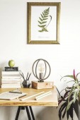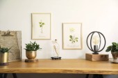 Zabytkowe wnętrze biura domowego z drewnianym biurkiem, kamerą retro i słojem DIY lasu. Kopiuj miejsce na napis.
