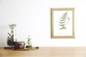 Nowoczesne wnętrze biura domowego z drewnianym biurkiem, książki, laptop, zabytkowe ilustracje roślin, lamp i akcesoriów biurowych.