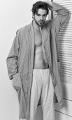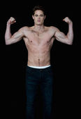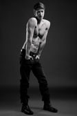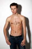 przycięte Zobacz sexy shirtless człowieka w dżinsy, pozowanie na szary