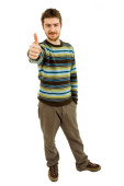 Zdjęcie "młody człowiek dorywczo będzie kciuk w w tle" może być wykorzystywane do celów osobistych i komercyjnych zgodnie z warunkami zakupionej licencji Royalty-free. Obraz jest dostępny do pobrania w jakości wysokiej rozdzielczości do 5760x3840.