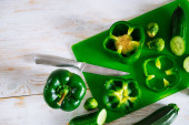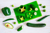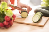 kobiety w biały t-shirt cięcia ogórków na pokładzie zielone. Zdrowe jedzenie koncepcja