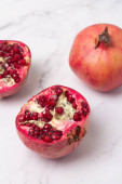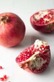 czerwony granat i ziarna granatu na białe tło zbliżenie i miejsca na tekst