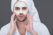 piękna dziewczyna z ręcznikiem na głowie i krem do golenia na twarzy dostosowanie okularów i patrząc daleko na białym tle na beżowy
