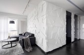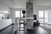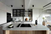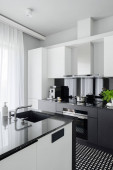 Sophisticated black and white kitchen interior with simple table and chair
