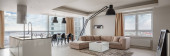 Wnętrze domu z czarnej kanapie, okrągły stół i lampa