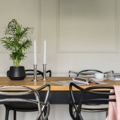 Pokój dzienny z drewnianym stołem i podłogi i czarny sufit napinany