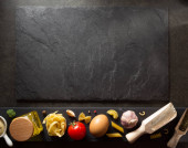 makaron, długi, Spaghetti lub Bucatini (składniki na makaron i sos) zestaw składników. tło żywności. miejsce