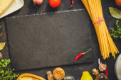 makaron, długi, Spaghetti lub Bucatini (składniki na makaron i sos) zestaw składników. tło żywności. miejsce