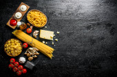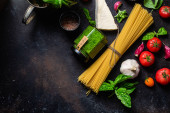 Zdjęcie "makaron, długi, Spaghetti lub Bucatini (składniki na makaron i sos) zestaw składników. tło żywności. miejsce" może być wykorzystywane do celów osobistych i komercyjnych zgodnie z warunkami zakupionej licencji Royalty-free. Obraz jest dostępny do pobrania w jakości wysokiej rozdzielczości do 5760x3840.