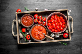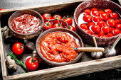 Sos pomidorowy z świeże i marynowane pomidory. Na czarnym tle.