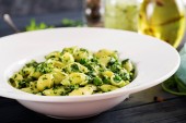 Makaron Conchiglie z pesto groch szpinak i zielony. Dania kuchni włoskiej. Wegańskie. Widok z góry