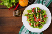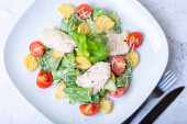 Zdjęcie "Zdrowe grillowanym kurczakiem Sałatka Cezar z pomidorami, serem i grzankami. Kuchnia Ameryki Północnej" może być wykorzystywane do celów osobistych i komercyjnych zgodnie z warunkami zakupionej licencji Royalty-free. Obraz jest dostępny do pobrania w jakości wysokiej rozdzielczości do 5760x3840.