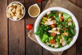 Zdrowe grillowanym kurczakiem Sałatka Cezar z pomidorami, serem i grzankami. Kuchnia Ameryki Północnej