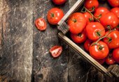 Świeże pomidory w drewnianej tacy. Na tle drewnianych.