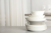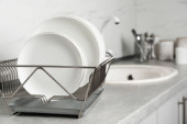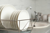 Suszarka do bielizny z czystymi naczyniami na kuchennym blacie