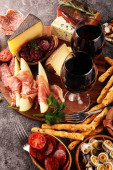 Wina włoskie Przystawki przekąski zestaw. Ricotta salata, śródziemnomorskiej oliwki, ogórki, Prosciutto di Parma, pomidory, karczochy i wino w okularach na stole