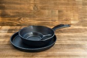 Kilka Patelnie żeliwne lub Skillets zdrowe gotowanie na szarym tle