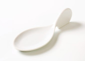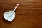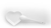 Minimalizm. Serce płyta i błyszczący ceramicznych łyżka na białym tle. Do projektowania na Walentynki, wesele, romantyczna kolacja.