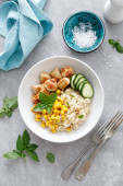 Hawajskie kłuć miska z krewetek, ryż i warzywa, zdrowe Buddha bowl z krewetkami, ryż, awokado, ogórek, pomidor i sałata