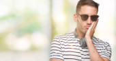 Młody przystojny mężczyzna nosi okulary patrząc myślenia na białym tle zmęczony i znudzony depresji problemów ze skrzyżowanymi ramionami.