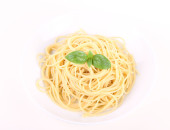 Spaghetti z pesto, ozdobione natką pietruszki na talerzu na białym tle