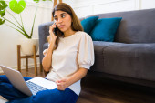 Zdjęcie "Atrakcyjna, młoda kobieta, swetrze podczas korzystania z telefonu komórkowego w domu" może być wykorzystywane do celów osobistych i komercyjnych zgodnie z warunkami zakupionej licencji Royalty-free. Obraz jest dostępny do pobrania w jakości wysokiej rozdzielczości do 5760x3840.