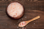 Sea pink salt in a wooden bowl on a wooden table. Rustic style