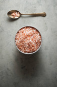 Sea pink salt in a wooden bowl on a wooden table. Rustic style