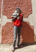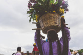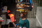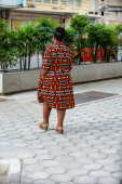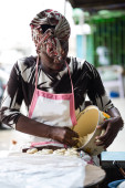 Zdjęcie "Abidjan, Wybrzeże Kości Słoniowej - 22 lutego 2017: African kobieta siedzi na stołku, szef związany przez wielobarwny szalik i taca, zawierające mąki manioku, patrzy w kamerę. Jest w pełnej produkcji attit, żywności, kochany przez wszystkich Ivorians" może być wykorzystywane do celów osobistych i komercyjnych zgodnie z warunkami zakupionej licencji Royalty-free. Obraz jest dostępny do pobrania w jakości wysokiej rozdzielczości do 5760x3840.