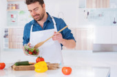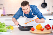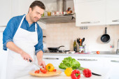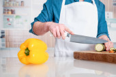 Człowiek krojenia warzyw stojąc w jego kuchni przygotowuje potrawy wegańskie