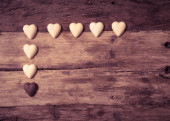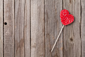 Dwa słodkie czerwone serce w kształcie lizaki na rustykalne drewniany stół i piękny romantyczny nastrój światła i rozmycie tła jako metafora miłości, wielokulturowego i koncepcji projektu samochodu pozdrowienia Valentines day.