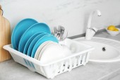 Zdjęcie "Suszarka do bielizny z czystymi naczyniami na kuchennym blacie. Miejsca na tekst" może być wykorzystywane do celów osobistych i komercyjnych zgodnie z warunkami zakupionej licencji Royalty-free. Obraz jest dostępny do pobrania w jakości wysokiej rozdzielczości do 5760x3840.
