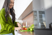 Stylish woman with long dark hair feeling excited before making salad