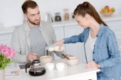 selektywne skupienie pięknej pary dorosłych w szatach o herbatę w kuchni