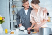 selektywnej ostrości dorosłych para w szaty podczas śniadania z naleśniki i sok pomarańczowy w kuchni