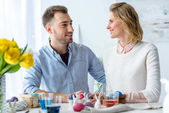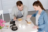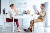 niezadowolony kobieta picia herbaty, podczas gdy człowiek czytanie gazety biznesowej podczas śniadania w kuchni