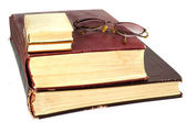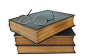 Stare książki i pióra na białym tle okulary