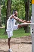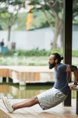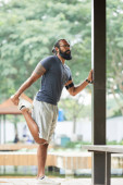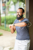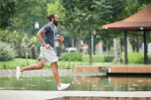Widok z boku Athletic Brodaty Indyjski człowiek z smartphone na ramię jogging na zewnątrz i słuchanie muzyki przez wkładki douszne