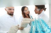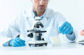 Selektywny fokus przystojny naukowca w ochronne okulary podejmowania eksperyment z mikroskopu na białym z symbolami medycznej tle