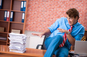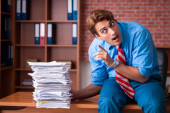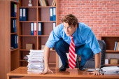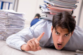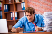 Zdjęcie "Młody pracownik z nadmierną pracą w biurze " może być wykorzystywane do celów osobistych i komercyjnych zgodnie z warunkami zakupionej licencji Royalty-free. Obraz jest dostępny do pobrania w jakości wysokiej rozdzielczości do 5760x3840.
