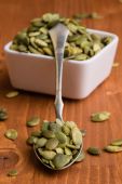 Nasiona dyni w drewniane płyty drewniane tła zdrowej ekologicznej żywności